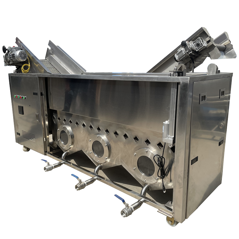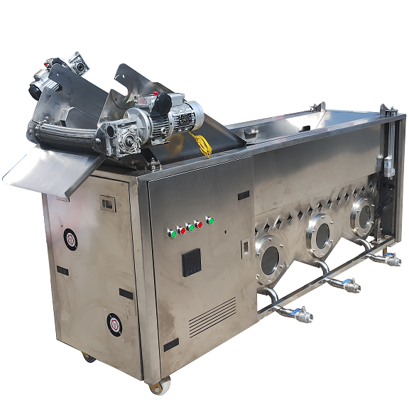 連續(xù)式油水混合油炸設(shè)備由一條在恒溫油槽中的不銹鋼網(wǎng)格傳送帶構(gòu)成 ,由雙網(wǎng)帶無級(jí)變速輸送系統(tǒng)、主油槽箱與輔助油箱組成的外循環(huán)過濾系統(tǒng)、PID油溫自控儀、XSM轉(zhuǎn)數(shù)線速儀表以及繩索提升裝置等組成,采用多種加熱方式給食用油加熱(電加熱或燃?xì)饧訜?。食品被緩慢地定量送入油中,下沉到浸泡在油中的傳送帶上 ,食品在炸熱和炸熟時(shí)呈懸浮狀。則被壓在另一條傳送帶下 ,食品油炸、上料及卸料采一條用傳送帶,減少中間環(huán)節(jié),卸料時(shí)斜坡提升使多余的油流回油槽中。
