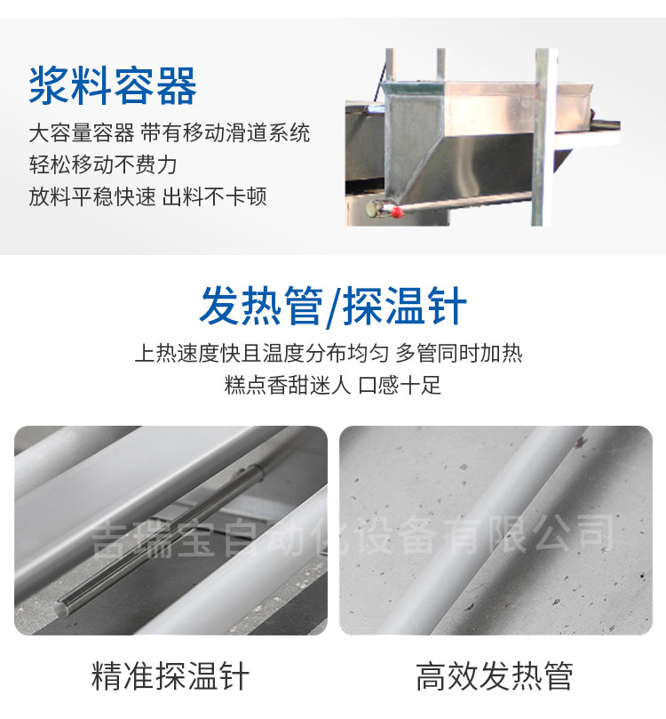 ⒈槽子糕機(jī)烤盤固定:對(duì)烤盤可直接固定,投料時(shí)可對(duì)烤盤直接投料,不需要人工搬進(jìn)搬出,節(jié)約大量時(shí)間,能量損耗以及人工費(fèi)用。